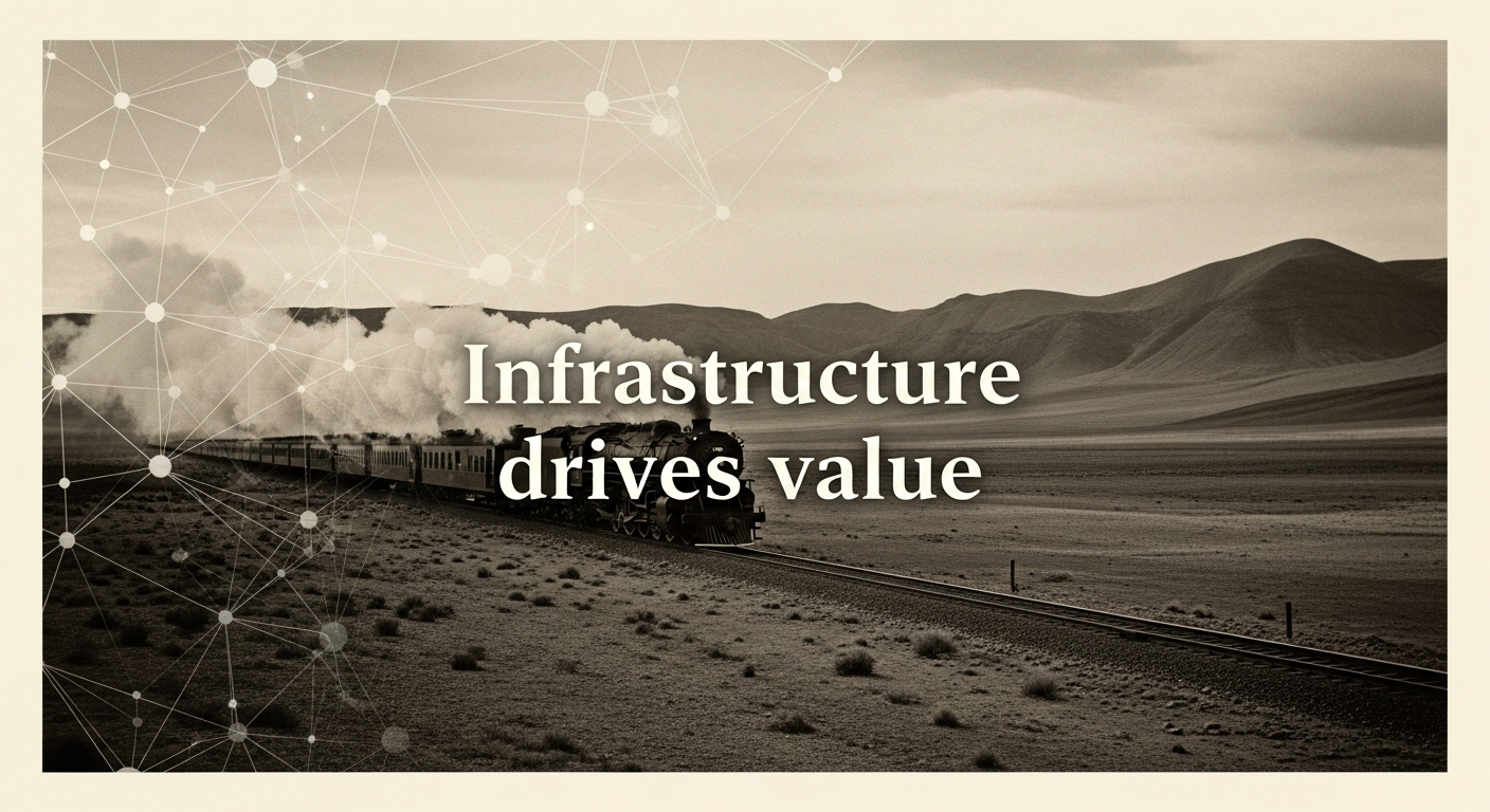 Railroads built America. Commerce, migration, industrialization—all rode the rails. Many railroad investors got wiped out. But the value wasn't captured by the builders. It was captured by everyone who used the tracks.